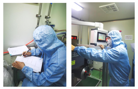 最先考核的是雙鋁包裝實操,生產部楊洪根據所學習的專業步驟進行操作,從最開始的雙鋁機調試到後麵的包裝正常運行,生產部總監林星、人力資源部經理張曉珂等考核人員對其操作過程進行評分,在這個過程中對楊洪進行實操考核關鍵點提問,楊洪對考核人員所提出的問題,逐一進行專業解答。